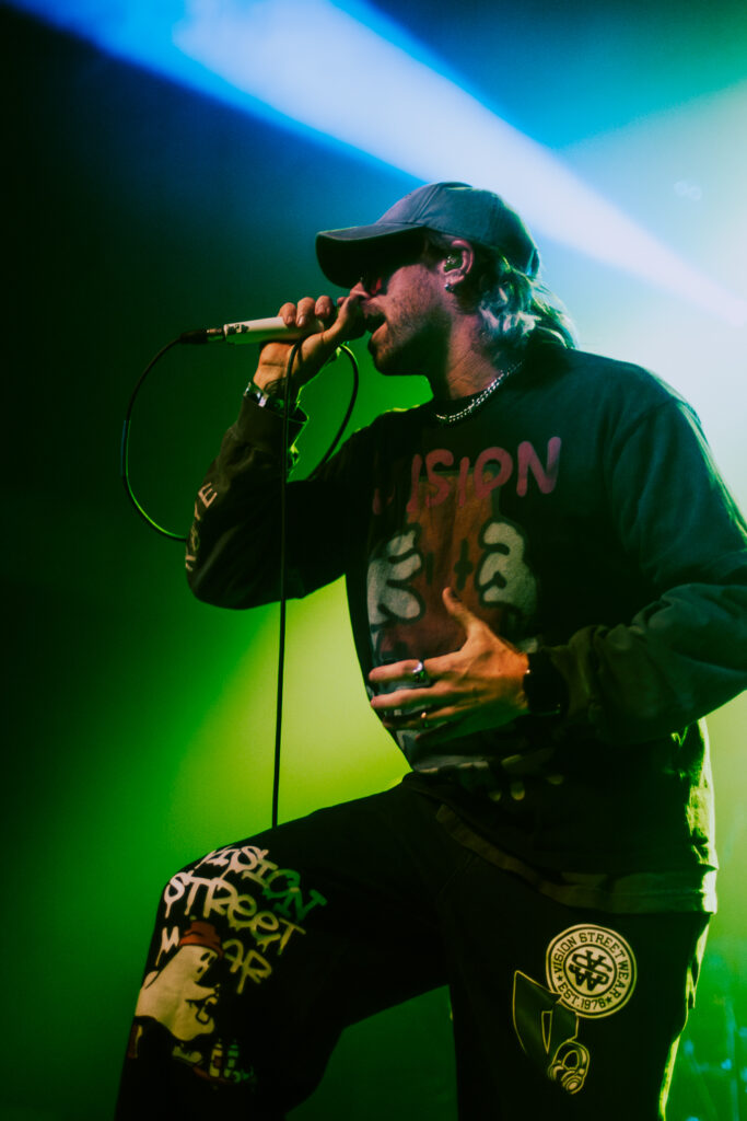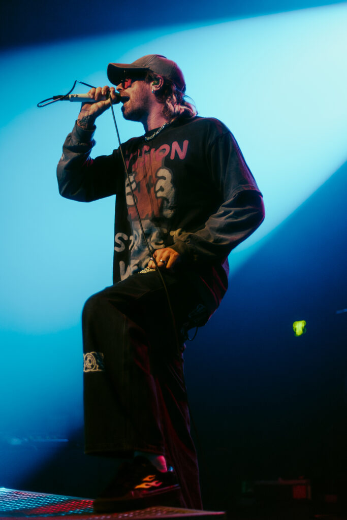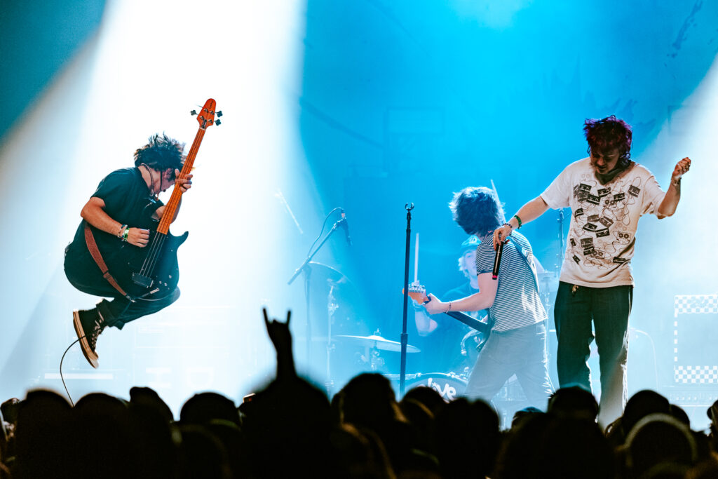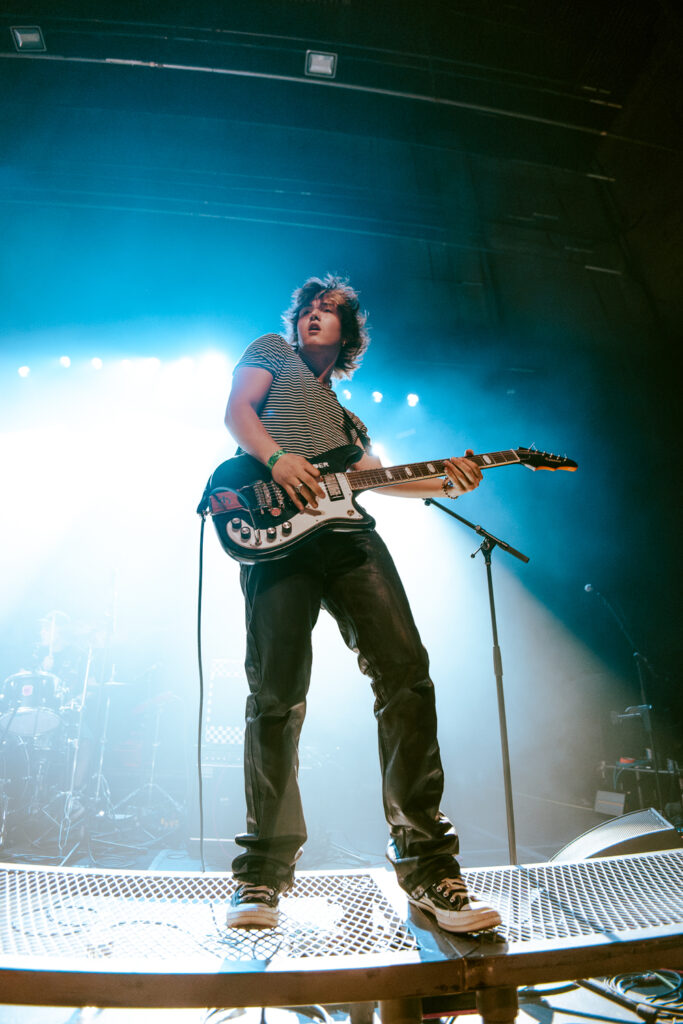 Los Angeles native rock band Point North took the stage. Singer Jon Lundin, guitarist and vocalist Andy Hershey, and drummer Josh Parra make up the three-piece. The heaviest band on the lineup, they were bathed in dark green and blue mood lighting to accentuate the atmosphere during their set. Lundin gave off calm and collected energy with his hat, sunglasses, and stunning vocals, while Hershey supplied the screams. Their latest release, “DEAD 2 ME,” got the mosh pit going, and it continued throughout the set. Another highlight was 2024 single “Bring Me Down,” with a catchy chorus that’s easy to get into. Point North has a more established fanbase than the other openers, and their fans in the audience sang along to one of their most popular songs, “Safe and Sound,” to finish off the set.