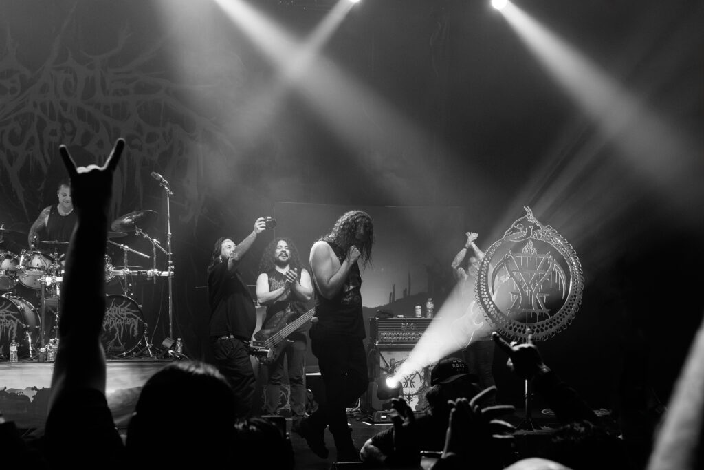 After the short break, fog machines began to fill the air and the stage lights dimmed. This tour was a celebration of Cattle Decapitation’s self proclaimed magnum opus record, 2019’s Death Atlas, and they were performing it in its entirety. One by one each band member made their way onstage, meanwhile multiple voices could be heard through the loudspeakers in different languages, each offering some kind of warning of impending doom. This signaled the introduction of the record, and then the band immediately launched into the first track, “The Geocide.” The band’s playing is mesmerizing, ferocious, and unrelenting. This is only enhanced by the album’s themes that call for the downfall of humanity and all around armageddon. Vocalist Travis Ryan is a master of his craft, seamlessly weaving low trembling gutturals, face melting goblin-like shrieks, and dare I say, melodic singing. This is especially highlighted during crowd favorite “Bring Back The Plague.”
