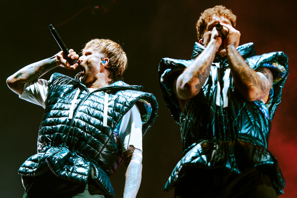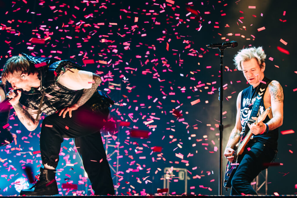 Finally, the lights went up, and the curtain fell down, revealing Electric Callboy – clad in matching black puffer vests – launching into “TANZNEID,” the title track of their upcoming album. The energy was already getting crazy, with the fans screaming and the band feeding off their adoration. Then, confetti erupts, blanketing the crowd, and the biggest surprise of the night: Deryck Whibley of Sum 41 struts on stage to join Electric Callboy for their version of “Still Waiting.”