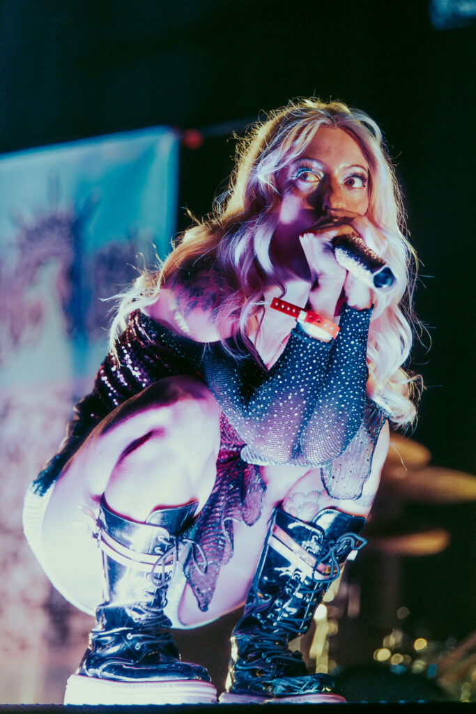 Opening the show was Hannah Collins, professionally known as Scene Queen, who coined the term “bimbocore” to describe a subgenre of metalcore with feminist themes. She preaches (screams) female empowerment unapologetically, her songs dealing with issues such as objectification, harassment, and misogyny. With bold, explicit lyrics dazzling with pink imagery, she balances the feminine rage flawlessly. She got the show going with brand new single “Manicure,” showing off her new low screams that she’s been working hard on. Going into “Barbie & Ken,” which features Cody Carson of Set It Off, a new intro with Carson was played, where he can’t join Collins on stage because he’s caught in the middle of a bowel movement. Collins instead asked her guitarist, Boy Hero (Daniel Rudd), to be the Ken to her Barbie. Playing a short set of nine songs, Collins successfully got the twerkle pit going, worked the stage, and screamed her heart out with the crowd for her first time at the Forum.