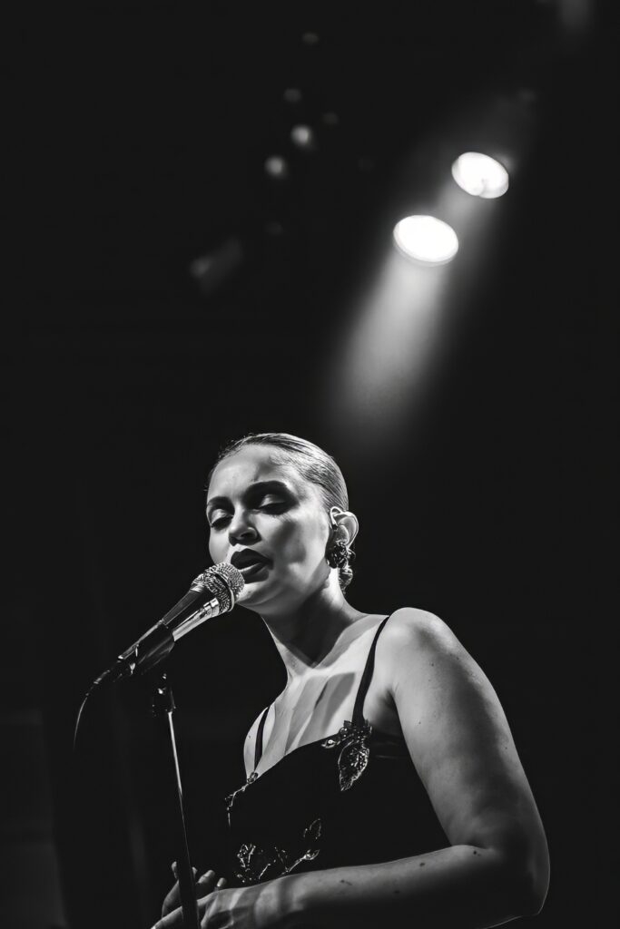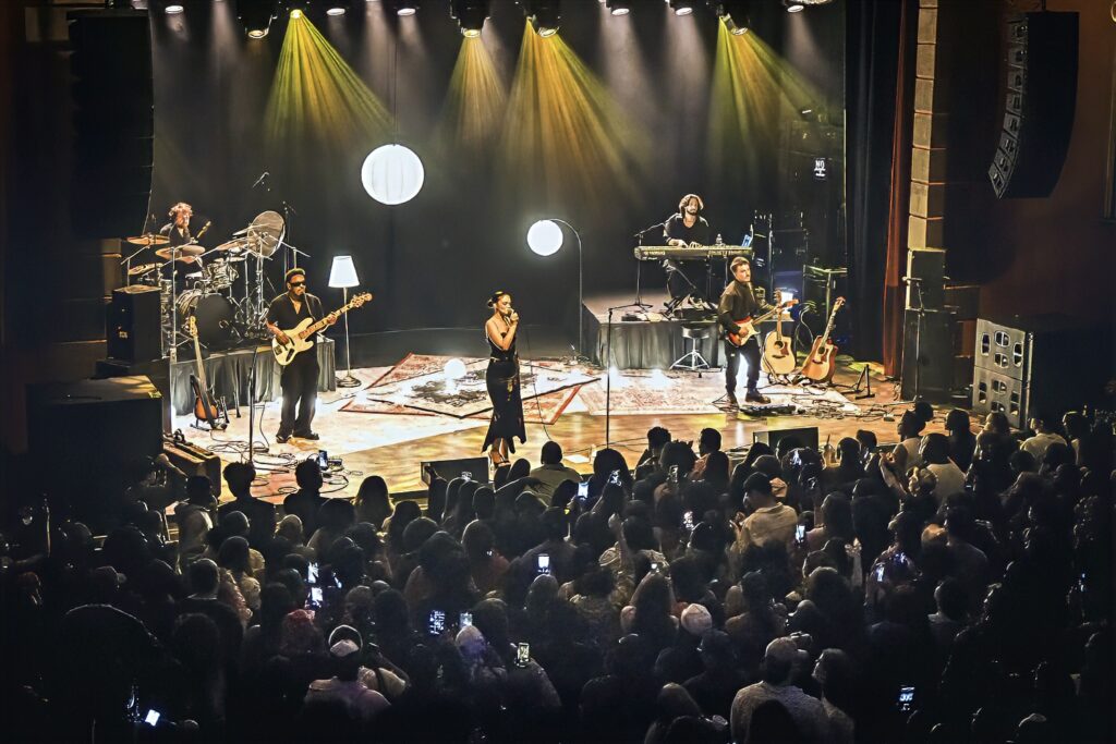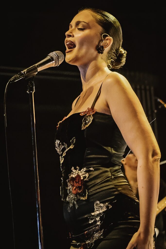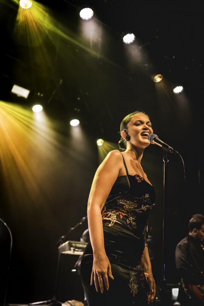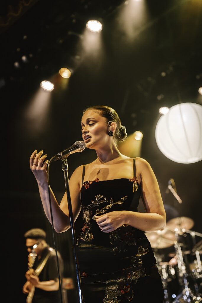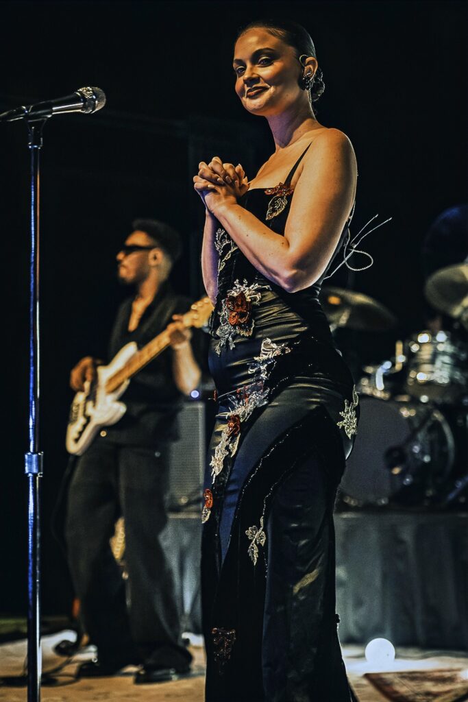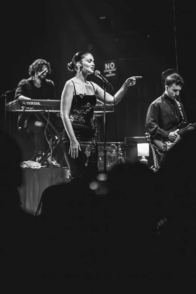 Fans filled the room early, and by the time the lights dimmed, the crowd had settled into a quiet anticipation different from the usual Friday night buzz. The stage gave off the feeling of a speakeasy known only to a few, the kind that required a password for entrance. When Claudio stepped onstage, the energy shifted into something calm yet energetic. Backed by her soulful, jazz-infused band, Sabrina started the night with “One Word” from her 2025 album Fall In Love With Her. She followed that with “Before It’s Too Late,” “Memory Foam,” and the title track, “Fall In Love With Her.”