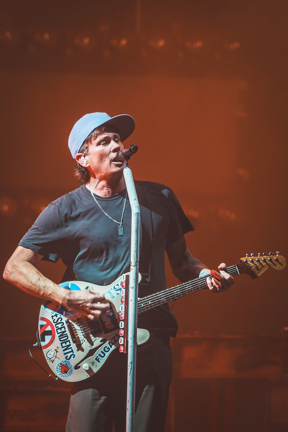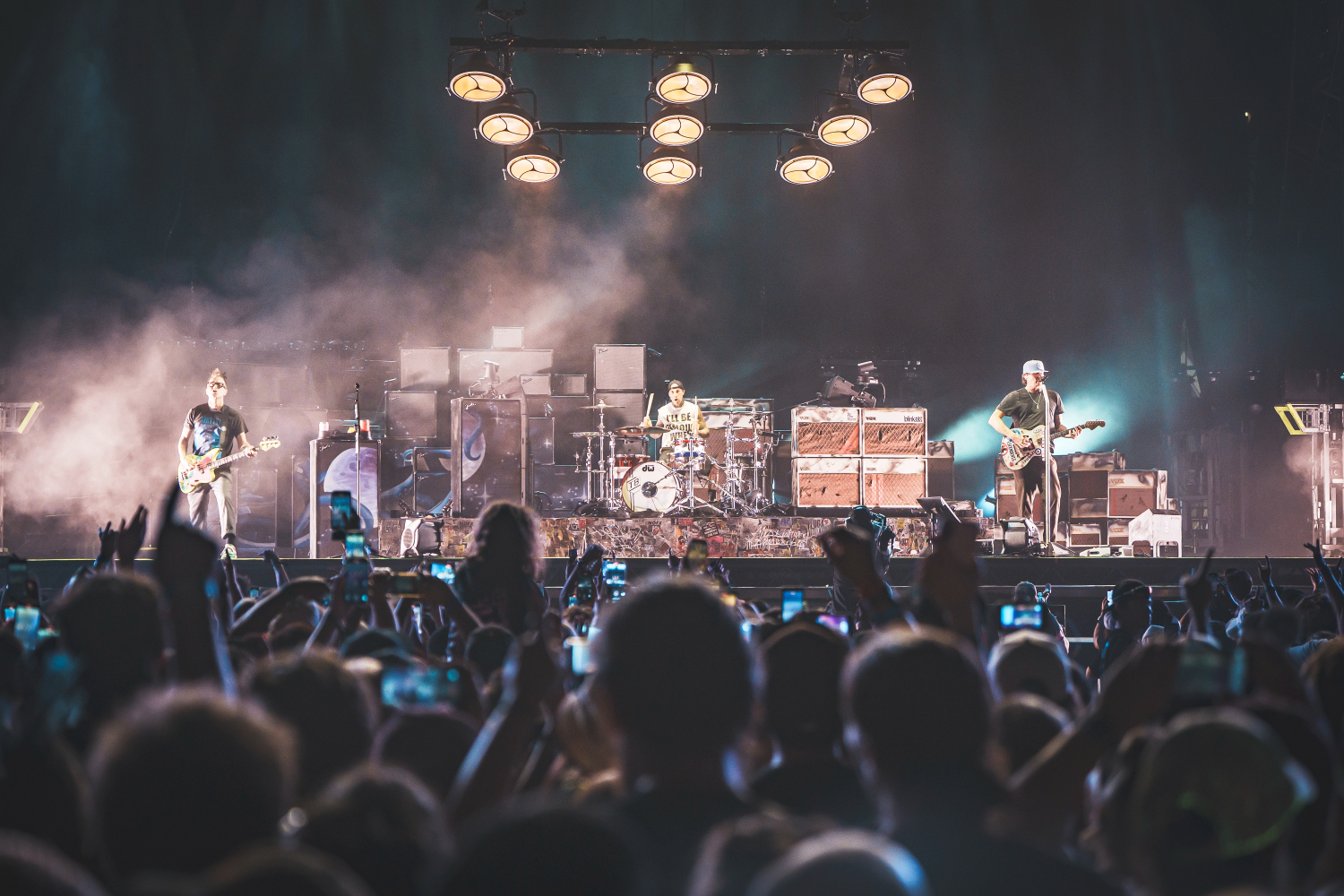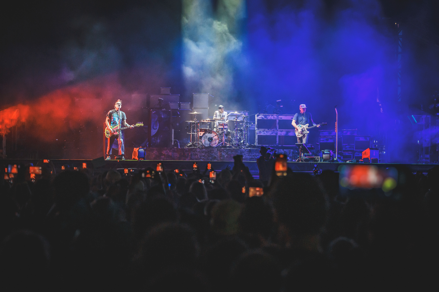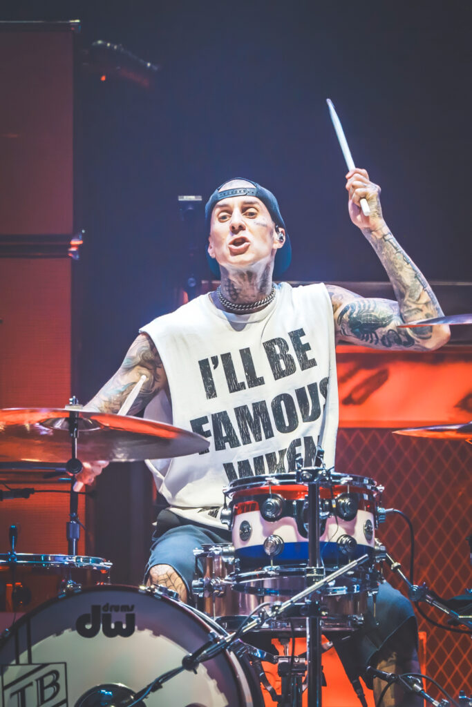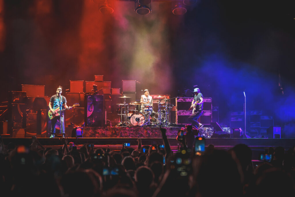 The trio’s fast-paced punk anthems, infectious lyrics, and irrepressible humor ignited the crowd, sending fans jumping, moshing, and screaming along to every chorus. Mark Hoppus and Tom DeLonge bounced across the stage with effortless charisma, while Travis Barker’s unmistakable drumming provided the heartbeat of that signature Blink-182 sound.