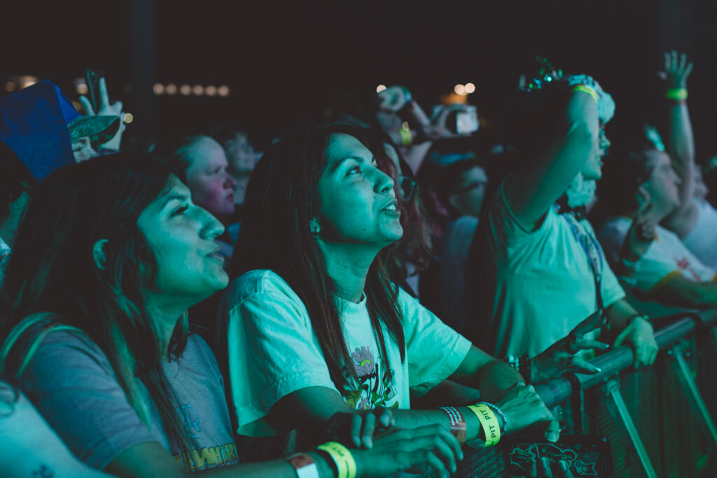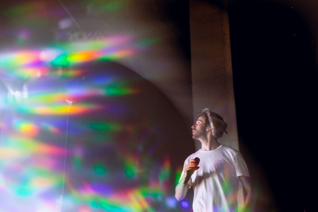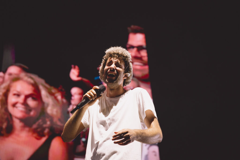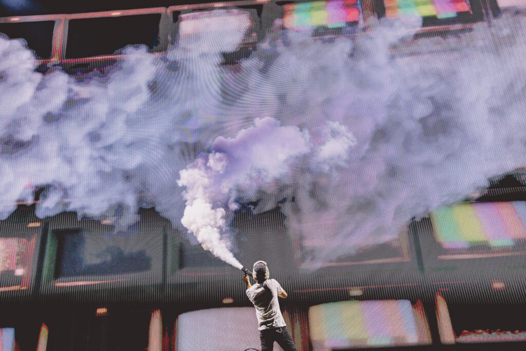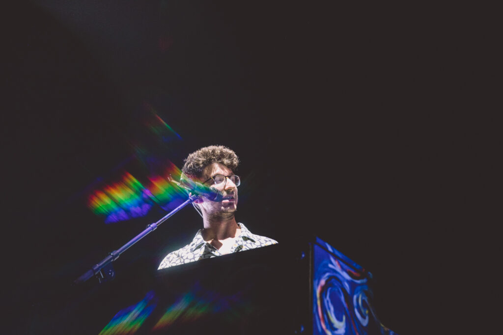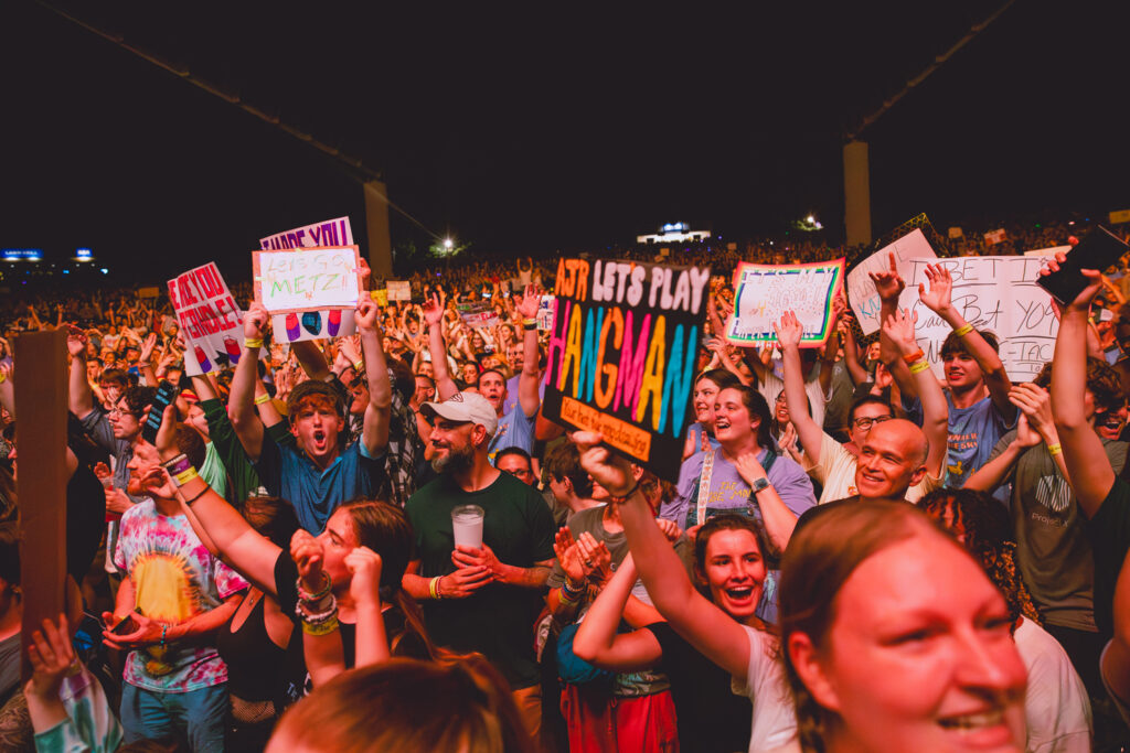 Thanks to Goth Babe and their lively performance, the crowd was jumping and dancing before AJR even set foot on stage. The energy was buzzing from the barricade to the lawn as The Pavillon was filled with echoing chants of “AJR!” Then, the lights dimmed and the opening tones of “Way Less Sad” filled the air, and the crowd ruptured into a flood of screams. This show was more than just live music; it was a visual and interactive experience, going along with the celestial themes of The Somewhere In The Sky Tour. Soon, the main stage was full of psychedelic optics of mind-bending video effects, retro TV static, and smoke machines.