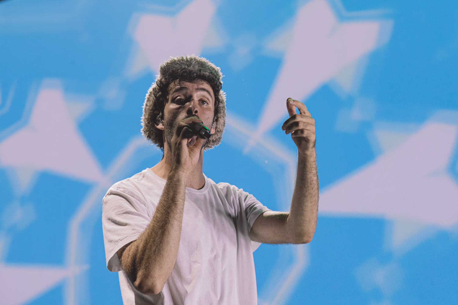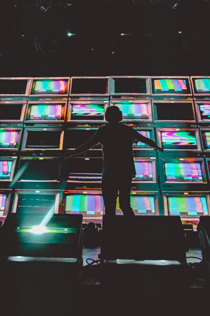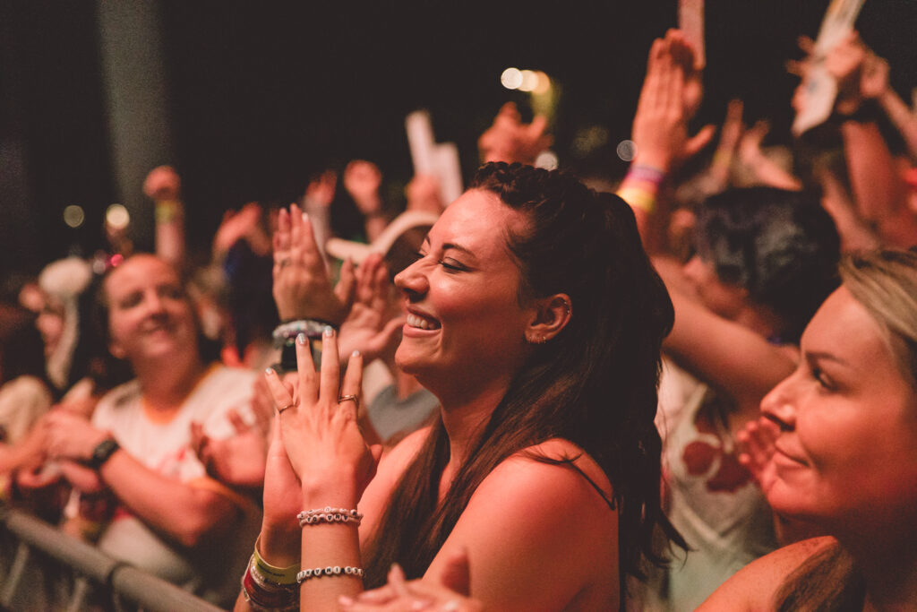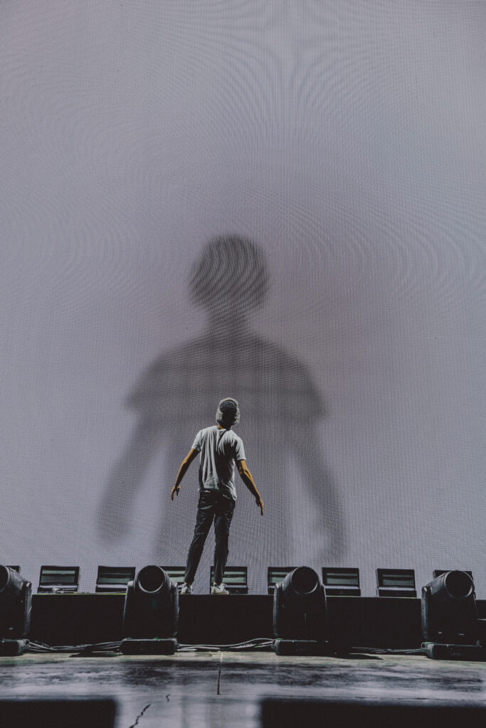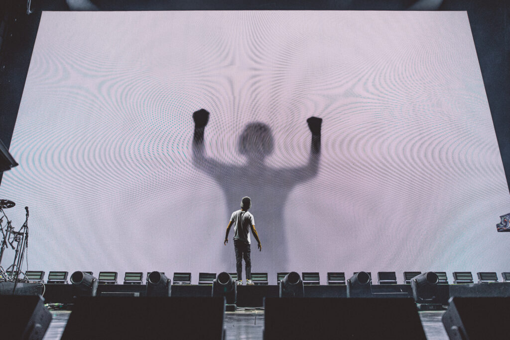 Thanks to Goth Babe and their lively performance, the crowd was jumping and dancing before AJR even set foot on stage. The energy was buzzing from the barricade to the lawn as The Pavillon was filled with echoing chants of “AJR!” Then, the lights dimmed and the opening tones of “Way Less Sad” filled the air, and the crowd ruptured into a flood of screams. This show was more than just live music; it was a visual and interactive experience, going along with the celestial themes of The Somewhere In The Sky Tour. Soon, the main stage was full of psychedelic optics of mind-bending video effects, retro TV static, and smoke machines.
